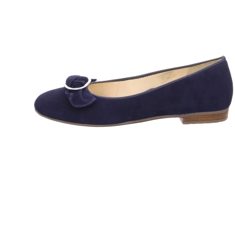 Schöne Ballerinas von Ara aus einem feinen hochwertigem Veloursleder. Innen ist der Schuh mit einem cromfrei gegerbtem Leder ausgestattet. Der Schuh hat eine normale Weite. Der stabile Blockabsatz hat eine Höhe von cirka 1 cm. Die Laufsohle ist aus Gummi. Die Schuhgröße fällt regulär aus.