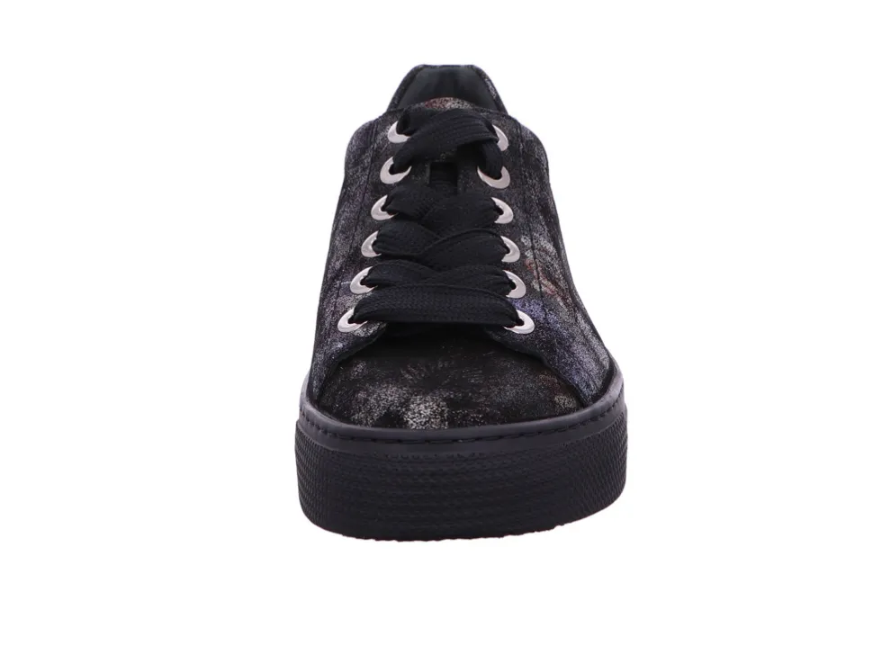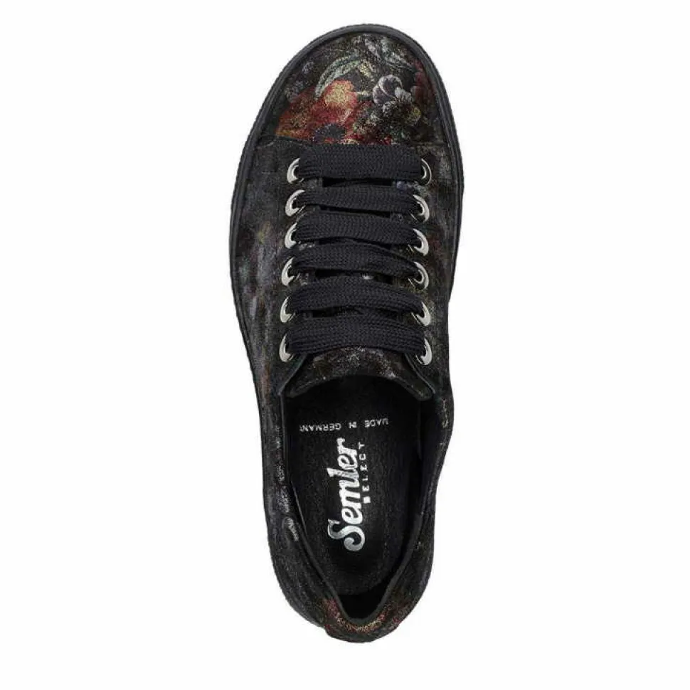 Flotte Damen Sneakers von Semler aus einem feinen hochwertigem geprägten Glattleder. Innen ist der Schuh mit einem cromfrei gegerbtem Leder ausgestattet. Der Schuh hat eine normale Weite. Der Absatz ist durchgehend flach. Die Laufsohle ist aus Gummi. Der Artikel verfügt über einen Schnürverschluss. Die Schuhgröße fällt regulär aus.