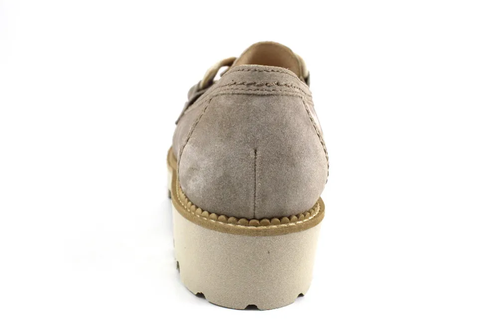 aus einem feinen hochwertigem Veloursleder. Innen ist der Schuh mit einem cromfrei gegerbtem Leder ausgestattet. Der Schuh hat eine normale Weite. Der stabile Blockabsatz hat eine Höhe von cirka 2 cm. Die Laufsohle ist aus Gummi. Die Schuhgröße fällt regulär aus.