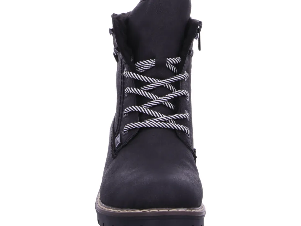 Schöne Damen Stiefeletten von Rieker aus einem feinen hochwertigem Kunstleder. Der Schuh hat eine normale Weite. Der stabile Blockabsatz hat eine Höhe von cirka 3 cm. Die Schuhgröße fällt regulär aus.