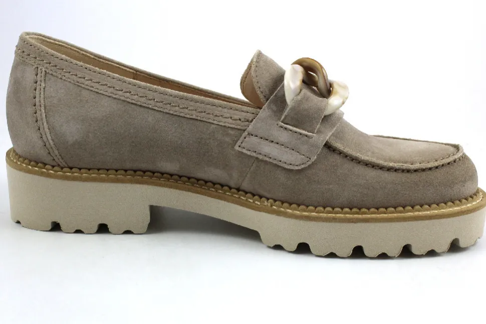 aus einem feinen hochwertigem Veloursleder. Innen ist der Schuh mit einem cromfrei gegerbtem Leder ausgestattet. Der Schuh hat eine normale Weite. Der stabile Blockabsatz hat eine Höhe von cirka 2 cm. Die Laufsohle ist aus Gummi. Die Schuhgröße fällt regulär aus.